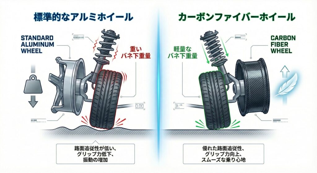 カーボンホイールのメリットは、走行性や走行安定性の高さです。従来のアルミホイールやスチールのホイールに比べると、バネ下の重量が軽くなっています。