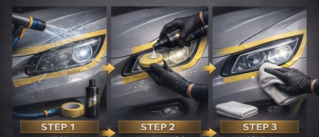 ヘッドライトクリーナーを正しく使うことで、除去効果や仕上がりの持続性が大きく変わります。一般的な手順は次の通りです。